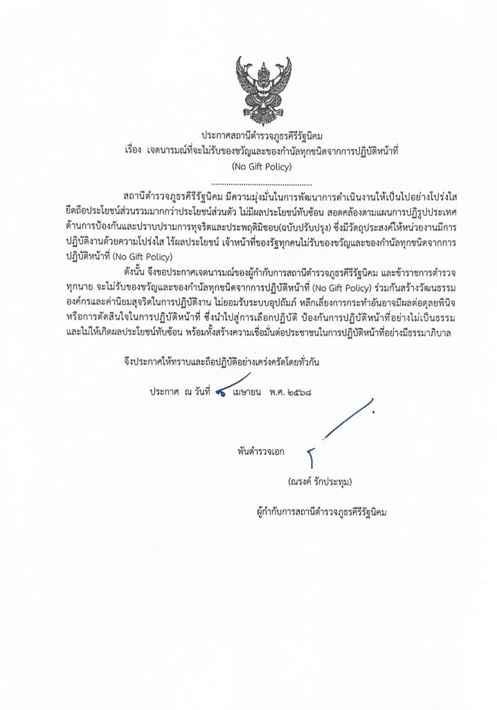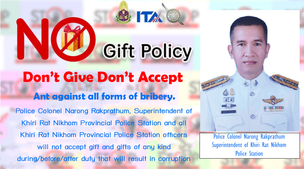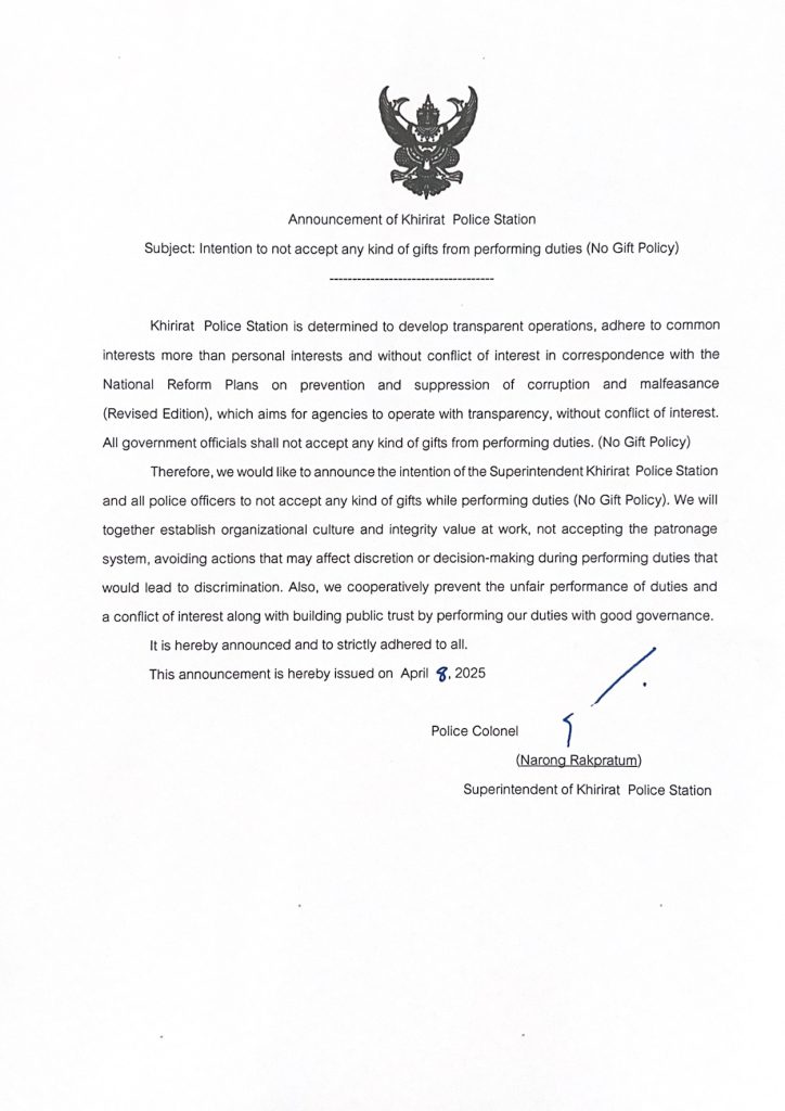 - ประกาศสำนักงานยุทธศาสตร์ตำรวจเรื่องเจตนารมณ์ที่จะไม่รับของขวัญหรือของกำนัลทุกชนิดจากการปฏิบัติหน้าที่