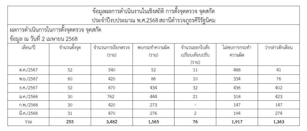 ข้อมูลผลการดำเนินงานของสถานีตำรวจในเชิงสถิติ ในการตั้งจุดตรวจ จุดสกัด(แยกรายเดือน)